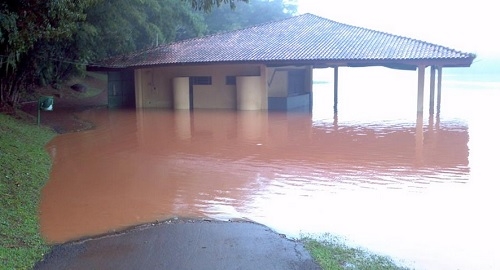 A chuva sem fim desta sexta-feira alagou o Parque do Lago de Campo Mourão. A antiga lanchonete (hoje usada por escoteiros) e a concha acústica ficaram debaixo da água. As fotos são do vereador Edson Battilani. O nível do Rio do Campo subiu tanto que por pouco o lago não atingiu até o pontilhão. Segundo do Simepar, choveu mais de 100 mm na cidade.