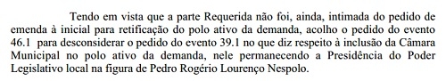 A juíza Luzia Terezinha Grasso Ferreira aceitou o pedido de Pedrinho Nespolo para desconsiderar um pedido de emenda sobre o polo ativo da ação.