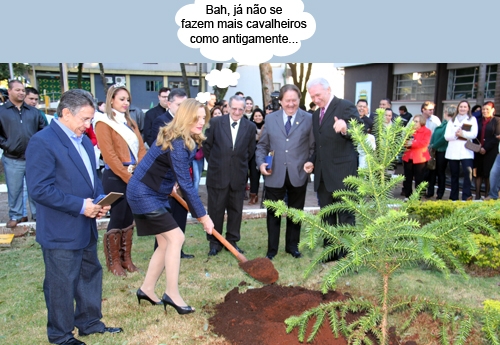 O clic é deste domingo, quando uma araucária foi plantada em frente à prefeitura para marcar os 50 anos de inauguração do Paço Municipal 10 de Outubro. O evento reuniu ex-prefeitos, parentes de ex-prefeitos, veraedores, lideranças e pioneiros, mas a prefeita Regina Dubay não escapou de ter que pegar na pá para fazer o plantio. De saltão e tudo. Ô dureza!...