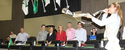 Teve toque de berrante na sessão da Câmara desta terça-feira. E por conta da rainha da 24ª Festa Nacional do Carneiro no Buraco, Renata Kelly de Souza. Ela estava junto com a prefeita Regina Dubay, que foi entregar os kits da festa para os vereadores. Cada kit tem um prato, uma caneca e uma camiseta, entre outras coisitas mais. A prefeita também teve direito a falar e convidou os "nobres edis" para a festança. Ah, como é linda essa harmonia entre os poderes...