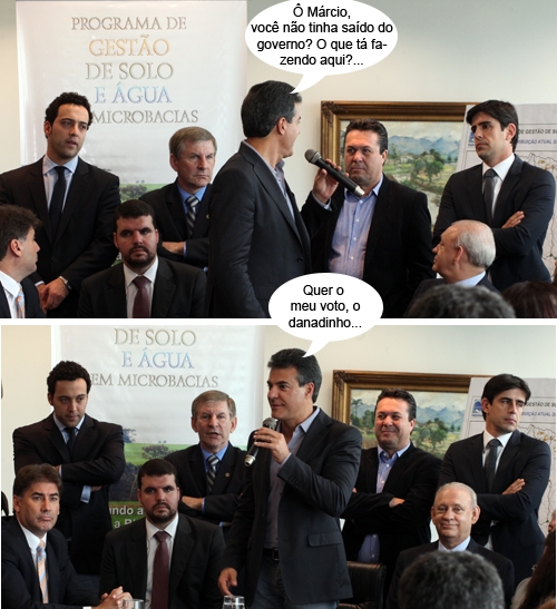O clic é da semana pasada, no Palacio Iguaçu, em Curitiba, durante solenidade de assinatura de convênios do programa de gestão de solos e água em microbacias. O mourãoense Márcio Nunes não está mais no Ipáguas, mas foi prestigiar o evento comandado pelo governador Beto Richa. Hummmmmm...