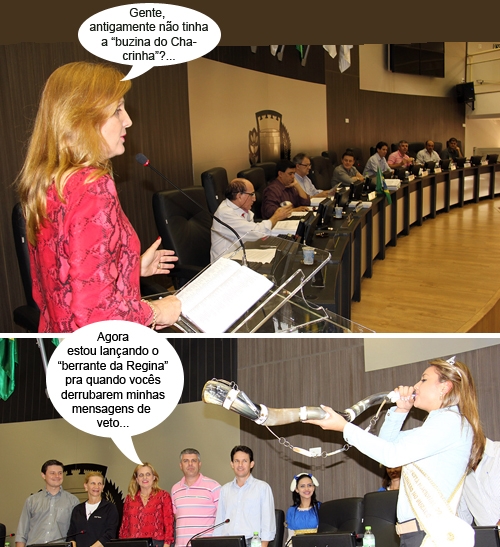 Os cliques são desta terça-feira, quando a prefeita Regina Dubay foi à sessão da Cãmara para convidar os vereadores para a Festa do Carneiro no Buraco. A rainha do evento, Renata Kelly de Souza, foi junto e fez uma demonstração do toque do berrante. Ah, tá pensano o quê!...