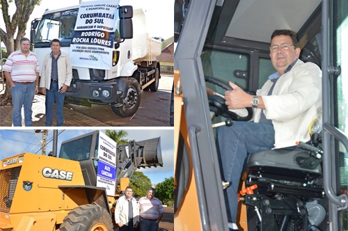 A prefeitura de Corumbataí do Sul recebeu duas pás-carregadeiras e um caminhão basculante. O prefeito Carlos Caxão foi conferir o equipamentos com direito a pose como operador de máquinas. O vice-prefeito Xandão Donato foi junto. Caxão lembrou que as aquisições tiveram uma mãozinha do deputado Alex Canziani e de Rodrigo Rocha Loures. "O município vai ganhar em economia e agilidade nos serviços", comemorou.