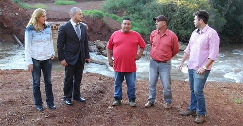 Foi iniciada nesta segunda-feira a construção da nova ponte sobre o rio da Várzea, no divisa de Campo Mourão e Luiziana. Tudo em parceria entre as duas prefeitura. Campo Mourão dá os materiais (R$ 53 mil) e Luiziana entra com a mão-de-obra. A ponte vai custar cerca de R$ 100 mil. A prefeita Regina Dubay foi ao local da obra e agradeceu a determinação do prefeito Mauro Slongo. No mais, como diria aquele antigo político, a ponte tem duas utilidades: serve pra quem vai daqui pra lá e pra quem vem de lá pra cá...