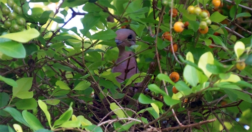 "Foto tirada na estrada velha pra Farol, sentido ao Alto Alegre. A pombinha deitadinha em seu ninho chocando seus ovos numa árvore repleta de flores e frutos a beira da estrada".