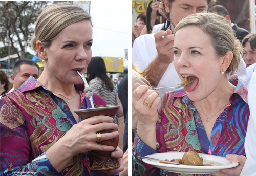Não é fácil a vida de vegetariano em festa gastronômica a base de carne. A senadora Gleisi Hoffmann que o diga. Na 24ª Festa Nacional do Carneiro no Buraco ela só deu uma beliscadinha em pedaços de cebola. Carneiro nem pensar. Menos mal que há 10 tipos de legumes e frutas no prato típico de Campo Mourão. Se serve de consolo, antes do almoço teve um chimarrãozinho.