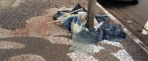 "Veja os entulhos de reformas que o banco HSBC deixou na rua São Paulo. Cadê a prefeitura que não fiscaliza?"