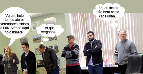 O clique é desta quinta-feira, na gabinete da prefeita Regina Dubay, quando foi assinado o contrato para os 7,5 km de pedras irregulares na estrada da Fazenda Boa Esperança. Os vereadores Isidoro Moraes e Luiz Alfredo estiveram presentes. Cá pra nós: não é todo dia que esses dois "nobres edis" vão ao gabinete, hein?...