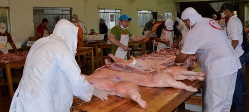 A festa é só no domingo, mas os 260 leitões que serão servidos na 12ª Festa do Leitão Maturado já foram abatidos. Também já foram desossados. Tudo pra começar o processo de maturação, que é o segredo do sucesso do prato típico de Goioerê.