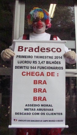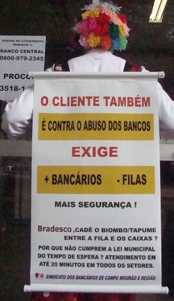 O Sindicato dos Bancários de Campo Mourão fez protesto nesta terça-feira em frente à agência do Bradesco. A bronca é que o banco não estaria cumprindo a lei municipal que estipula prazo máximo para o atendimento de clientes. Também é a única agência da cidade que não disponibilizou biombos entre a fila e o caixa e nem o porta objetos, que também são obrigados por lei. Portanto, para o Sindicato, o Bradesco não é "bra", é só blá-blá-blá...