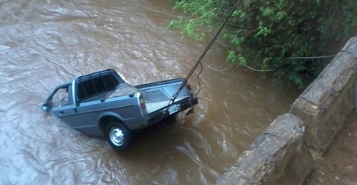 Guindaste retira camioneta de morador de Farol que caiu dentro de rio Goioerê. A imagem é do programa de Aldery Ribeiro (TV Carajás). O motorista teve apenas ferimentos leves, mas o carro ficou submerso. O Corpo de Bombeiros teve que procurar o veículo no fundo do rio. O condutor disse que foi a segunda vez que caiu com mesma Pampa no mesmo rio. Ah, e ainda dizem que um raio não cai duas vezes no mesmo lugar...