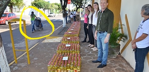 A prefeitura de Moreira Sales entregou o óleo que foi arrecadado na ExpoSales. A entrega contou com a participação do prefeito Luiz Volpato. São mais de oito mil litros de óleo serão doados para cerca de 30 entidades municipais. Legal. Só que na hora da foto, o óleo foi colocado todo na calçada e, repare lá no fundo, a mãe com o carrinho de bebê teve que passar pela rua...
