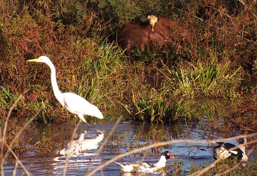 "No Parque do Lago, imagem um tanto inusitada. O casal de patos nadando, a garça caminhando tranquilamente, ao fundo as capivaras dormindo gostoso e o gavião carrapateiro catando seus carrapatos". Altair José dos Santos