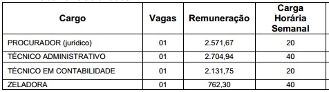 São quatro vagas - procurador jurídico, técnico administrativo, técnico em contabilidade e zeladora.