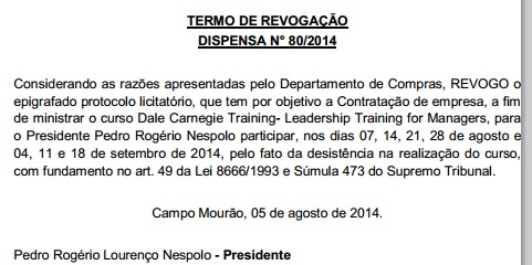 O presidente da Câmara, Pedrinho Nespolo, não vai mais participar do curso "Dale Carnegie Training- Leadership Training for Managers". A desistência foi publicada em edição extra do "Orgão Oficial" que saiu nesta quarta-feira. Uma empresa de Cianorte seria contratada por R$ 3,9 mil para ministrar o curso, em sete dias. Com a decisão, a dispensa de licitação está revogada. E não se fala mais nisso...