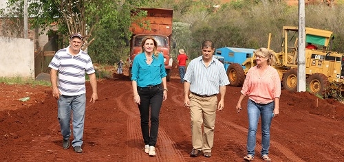 A prefeita Regina Dubay foi nesta segunda-feira acompanhar o início das obras de pavimentação asfáltica nas ruas Diógenes Cabral e Padre João Viecelli, no jardim Maia 2. A obra inclui galerias pluviais. O vereador Jorge Pereira, o presidente da Associação de Moradores, Nelson Davanço, e a vice-presidente Marlene Freitas, acompanharam a prefeita. E o sapatinho, óh!...