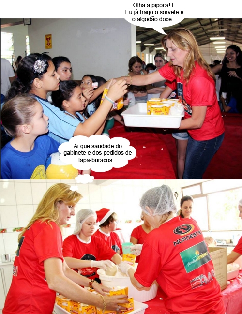 Pensa que vida de prefeita é fácil, é? Na quinta-feira, durante o segundo dia do Natal Encantado, do Provopar de Campo Mourão, a prefeita Regina Dubay deu uma mãozinha na hora da distribuição da pipoca para a criançada. Ah, quem disse que só o gabiente dá dor de cabeça?...