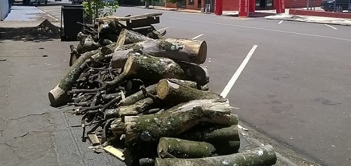 Faz mais de um mês que foram cortadas árvores públicas da rua São José, entre as avenidas Capitão Índio Bandeira e Manoel Mendes de Camargo. Como dá pra ver, os troncos continuam por lá, atrapalhando (e enfeiando) o passeio público). Calçada sem árvore já é feia, com troncos esquecidos, então...