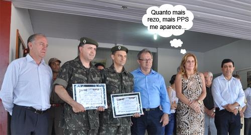O clic é deste fim de semana, quando a Câmara entregou moções aos subtenentes Osvaldo Almeida Jr e Leandro Scapin, no Tiro de Guerra de Campo Mourão. A prefeita Regina Dubay participou e ficou no meio de vereadores do "inimigo" PPS - Sidnei Jardim, Edson Battilani e Edson Lima. O presidente da Câmara, Toninho Machado, e a vereadora Professora Vilma também estiveram por lá.
