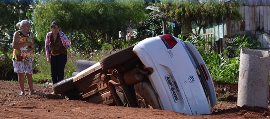 Tá irritado com o buraco na rua de sua casa? Eis o consolo. Olha o tamanho do buraco que "engoliu" o carro no jardim Anchieta, em Roncador. A cratera é por causa de obras no local. Os moradores reclamam que não existe sinalização para avisar do perigo. Apenas o motorista estava no Gol e não se feriu. Ufa!...