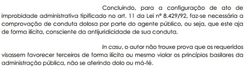 "Embora se tenha vislumbrado algumas irregularidades, nada nos autos indica que tenham sido feitas com o intuito de satisfazer interesses pessoais ou beneficiar terceiros, ou seja, que tenha havido o dolo necessário para configuração do ato ímprobo".