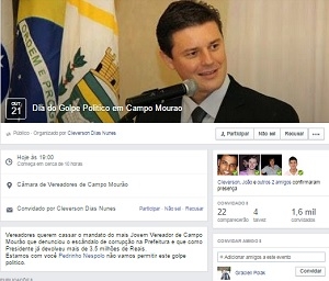 "Vereadores querem cassar o mandato do mais jovem vereador de Campo Mourão, que denunciou o escândalo de corrupção na prefeitura e que, como presidente, já devolveu mais de R$ 3,5 milhões. Estamos com você, Pedrinho Nespolo, não vamos permitir este golpe politico".
