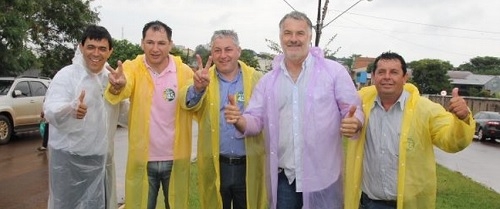 Que chuva, que nada! Mesmo com o tempo não colaborando, o deputado Douglas Fabrício seguiu no fim de semana com o tour de agradecimentos dos votos. O clic é de Mamborê, onde aparece ao lado do prefeito Nei Calori, do vice-prefeito Paulo Rotta e do vereador mourãoense Sidnei Jardim. Douglas também foi embaixo de chuva a Ubiratã. Ah, São Pedro não contava com essa astúcia...