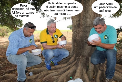 O clic é da semana passada. O deputado Douglas Fabrício já estava reeleito, mas seguia percorrendo a região pra agradecer os votos e pedir votos para o tucano Aécio Neves. Aí, na correria, nem sempre dava pra almoçar no restaurante. Às vezes tinha que ser na marmitinha, embaixo da árvore mesmo. Ô dureza...