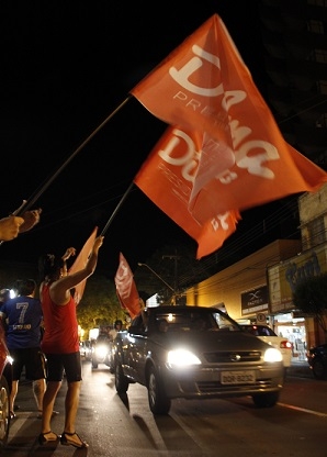 Teve bandeiraço e foguetório no centro de Campo Mourão, neste domingo à noite, para comemorar a reeleição da presidente Dilma Rousseff. A petista foi reeleita com 51,64% dos votos. Ela somou 54.499.812 votos, cerca de 3,5 milhões a mais que o tucano Aécio Neves, que ficou com 51.041.010 (48,36%). Entre os presentes na festa, a vereadora Professora Vilma e a secretária municipal Sônia Singer (Cultura), ambas do PT.