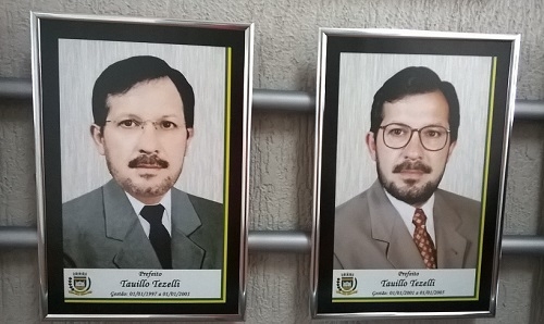 A foto mostra os dois quadros do ex-prefeito Tauillo Tezelli na "galeria dos ex-prefeitos" que a prefeitura inaugurou em junho no hall de entrada do Paço Municipal 10 de Outubro. Há um errinho aí. As fotos estão invertidas. Foi ao iniciar o primeiro mandato, em 1997, que Tauillo usava esses óculos maiores.