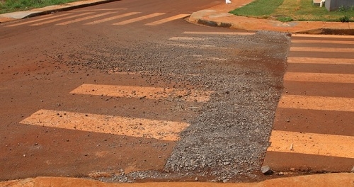 "Alô Sanepar! As obras da rede de esgoto passaram por ruas do jardim Araucária, mas nem todo buraco aberto foi tapado com deveria. No lugar do asfalto, colocaram apenas pedras, o que, além de feio, é um perigo para motociclistas e ciclistas".