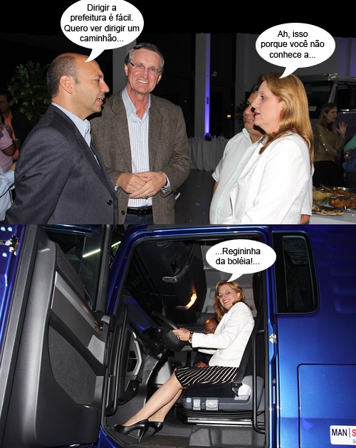 Os cliques são desta quinta-feira, quando aconteceu a inauguração das novas instalações Chiapetti, revendedora dos caminhões Volkswagen e Man. Fica na saída para Guarapuava. A prefeita Regina Dubay esteve por lá, conversou com o diretor da empresa, Itacir Naximiniano Chiapetti, e não resistiu seu experimentar a boléia de um caminhão.