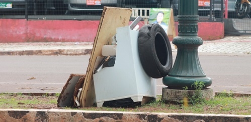 "Tem de tudo pelos canteiros centrais de Campo Mourão. Nesse aí, na av. Irmãos Pereira, entre as ruas Devete de Paula Xavier e Roberto Brzezinski, tem de pneu a pedaços de máquina de lavar".