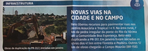 Trecho de texto de material de campanha de reeleição do governador Beto Richa (PSDB), distribuído nesta terça-feira em Campo Mourão, falando da duplicação da rodovia para Maringá, que é pedagiada.