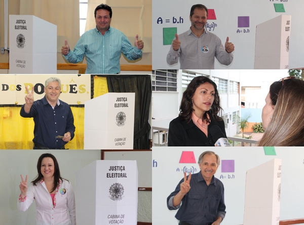 Os seis candidatos a deputado (quatro a estadual e dois a federal) que moram em Campo Mourão votaram pela manhã. Márcio Nunes (PSC) votou primeiro, pouco deposi das 8h, no colégio Santa Cruz. Na sequência, votaram Osni Menezes (PSC), no Sesc; Douglas Fabrício (PPS) e Maria Nysa (PDT), no Integrado; Marla Tureck (PSD), no colégio Marechal Rondon; e José Turozi (PV), no Sesc. Portanto, agora é só rezar...
