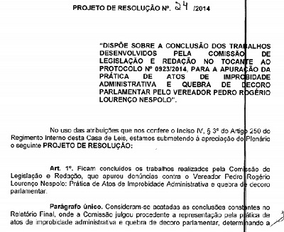O projeto diz que denúncia foi acatada e que o vereador deve ter a "perda imediata do mandato".