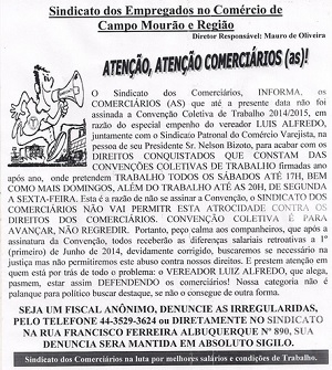 Em panfleto distribuído no comércio, Oliveira diz que o Sindicato Patronal e o vereador querem acabar com conquistas dos trabalhadores na convenção coletiva.