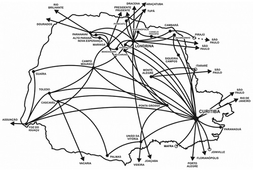 Olha aí o mapa mostrando com era a malha aérea do Paraná em 1956. Repare que Campo Mourão aparece com linhas para Foz do Iguaçu, Guaíra, Toledo, Maringá, Londrina, Ponta Grossa e Curitiba. Isso há 58 anos.