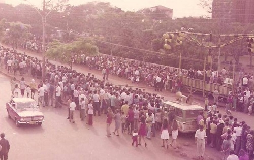 Já que, por causa da chuva, não teve desfile neste domingo, a gente recorre ao 7 de Setembro de 1972, quando o desfile ainda era realizado na av. Capitão Índio Bandeira. O clic é do acervo do Museu Municipal. Repare que a praça São José ainda tinha um muro (ao fundo aparece o hotel Santa Maria). E veja que existia semáforo da esquina da rua Brasil. Viu só, em Campo Mourão sinaleiro é coisa do passado...