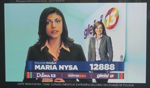 Candidata a deputada estadual pelo PDT, a delegada de polícia Maria Nysa Moreira Nanni apareceu no horário eleitoral de tevê desta segunda-feira. Pediu voto com a foto da governadorável Gleisi Hoffmann (PT) ao fundo. Agora todos os deputáveis de Campo Mourão já deram seus recados na telinha. Portanto, já pode acabar esse negócio...