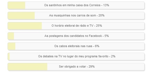 Completou o pódio a alternativa "As musiquinhas dos carros de com", com 20%.