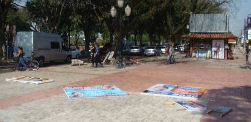Aos poucos, as placas com propaganda eleitoral foram aparecendo pelas ruas de Campo Mourão. Nesta terça-feira, quem deu um jeitinho nelas foi o vento, que derrubou todas. T-o-d-a-s! Não ficou nenhuma em pé. Ah, ventinho danado...