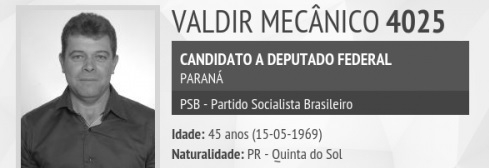 Você sabia que Quinta do Sol tem candidato a deputado federal? É o vereador (quarto mandato!) Valdir Mecânico, que disputa uma cadeira no Congresso Nacional pelo PSB (o partido da Marina). Ele apareceu nesta terça-feira no horário eleitoral falando em representar o "Vale do Ivaí". Em Quinta do Sol a campanha dele está na rua, com placas espalhadas pela cidade e tudo. Tá pensando o quê!...