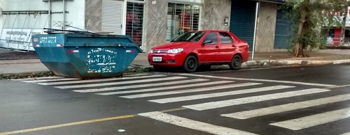 "Olha onde o cidadão colocou a caçamba! Na faixa de pedestre, bem em frente ao colégio Santa Cruz, na rua Araruna".
