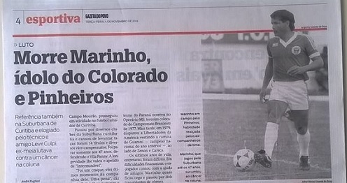 Foi destaque na Gazeta do Povo desta terça-feira a morte do ex-jogador Marinho, 63. Ele morreu de câncer na coluna. A manchete do jornal lembra que o atleta foi ídolo no Pinheiros e no Colorado (times que deram origem ao Paraná). Marinho também jogou no Sport Campo Mourão. Foi em 1991, já no final de carreira, quando estava perto dos 40 anos. Depois do Sport, ele ainda atuou em times amadores de Curitiba até os 47 anos.
