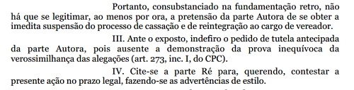 No despacho, o juiz rebate os três argumentos e frisa que, "ao menos por ora", não vê motivos para suspender a cassação.