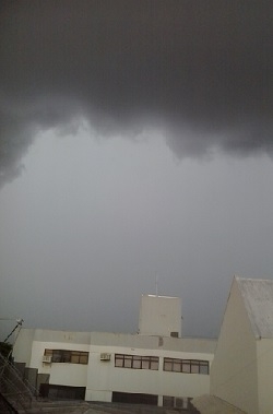"Tirei esta foto da janela do prédio onde trabalh, na na av. Irmãos Pereira esquina com a rua Araruna, na sexta-feira, por volta das 15h20. No começo da noite, fiquei sabendo que esse temporal, que graças a Deus chegou fraco em Campo Mourão, havia tombado duas carreta na rodovia próximo a Juranda". Jair Sousa de Lima