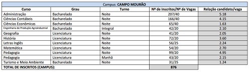 Entre os 10 cursos com maior número de inscritos, dois são de Campo Mourão - administração (207) e ciências contábeis (166).