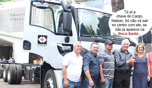 O clic é desta sexta-feira, quando foi feita a entrega oficial de novos equipamentos à Codusa. Um deles é esse caminhão aí, que será adaptado para atuar no tapa-buracos. A prefeita Regina Dubay entregou a chave para o novo presidente da empresa, o ex-prefeito Nelson Tureck.