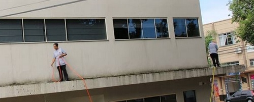 "Zeladoras trabalham na marquize da Câmara de Campo Mourão sem usarem equipamentos de segurança".